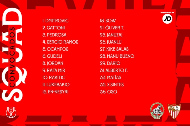 La convocatoria copera de 22 la completan, por tanto, los siguientes futbolistas: los porteros Dmitrovic, Alberto Flores y Matías; los defensas Juanlu, Darío, Gattoni, Sergio Ramos, Gudelj, Xavi Sintes, Kike Salas, Pedrosa y Oso; los centrocampistas Joan Jordán, Manu Bueno, Sow, Óliver Torres, Rakitic, Januzaj, Lukébakio, Ocampos; y los delanteros Rafa Mir y En-Nesyri.