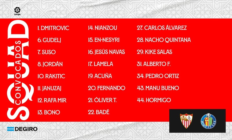 La lista completa la componen: los porteros Dmitrovic, Bono y Alberto Flores; los defensas Nianzou, Jesús Navas, Acuña, Badé, Kike Salas y Hormigo; los centrocampistas Gudelj, Suso, Joan Jordán, Rakitic, Januzaj, Lamela, Fernando, Óliver Torres, Carlos Álvarez, Nacho Quintana, Pedro Ortiz y Manu Bueno; así como los delanteros En-Nesyri y Rafa Mir.