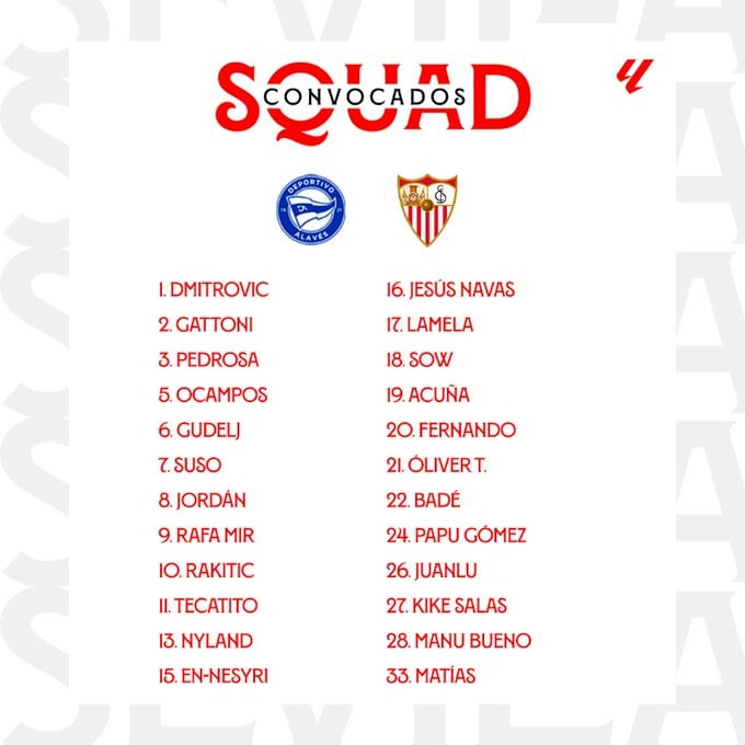 Así las cosas, la lista de 24 futbolistas convocados al completo, la conforman: Dmitrovic, Nyland; Jesús Navas, Badé, Gudelj, Gattoni, Acuña, Pedrosa, Fernando, Sow, Jordán, Rakitic, Papu Gómez, Óliver Torres; Ocampos, Suso, Lamela, Tecatito; En-Nesyri y Rafa Mir, más los canteranos Matías Árbol, Juanlu, Kike Salas y Manu Bueno.