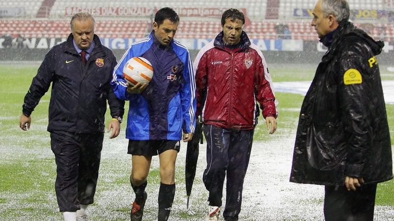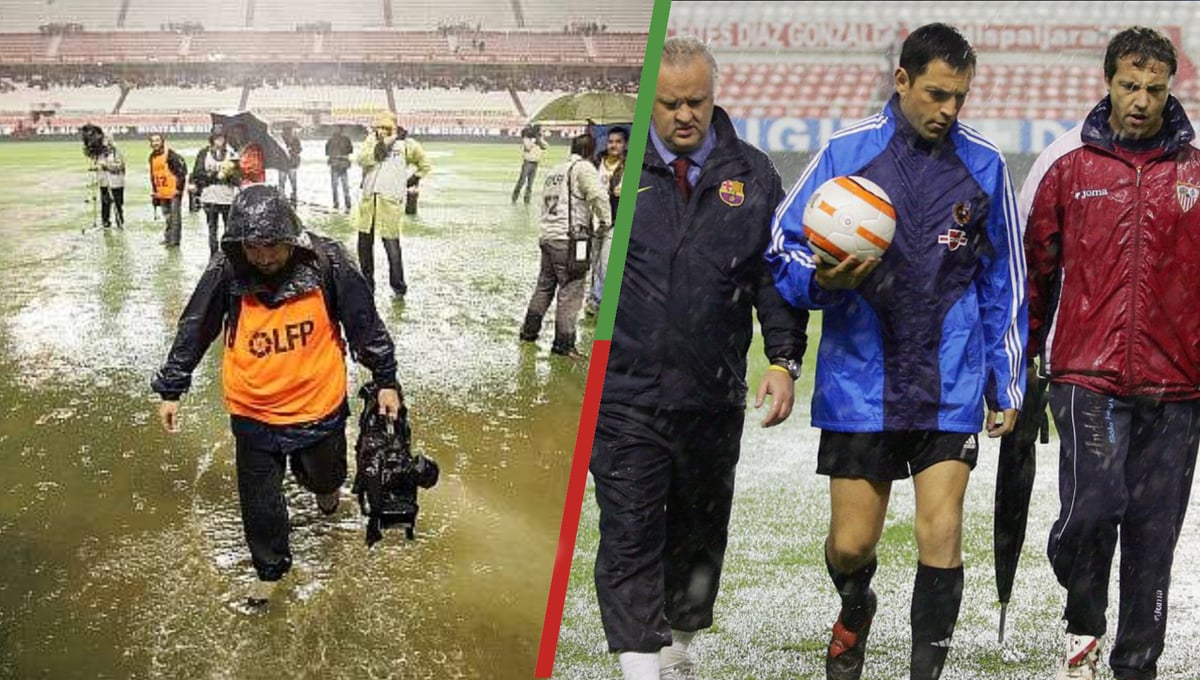 Hacía 20 años que no se suspendía un choque liguero en Nervión por inclemencias meteorológicas. Fue el 23 de abril de 2006, en un duelo entre el Sevilla FC y el FC Barcelona en la jornada 34 de LaLiga 05/06. El árbitro Teixeira Vitienes y los dos delegados saltaron al terreno de juego del Sánchez-Pizjuán, convertido en una piscina de granizo, para comprobar que el balón no botaba. Apenas una hora después no había ni rastro de agua; pero, aunque el técnico Frank Rijkaard rajó de lo lindo, a ambos les interesaba aplazar.