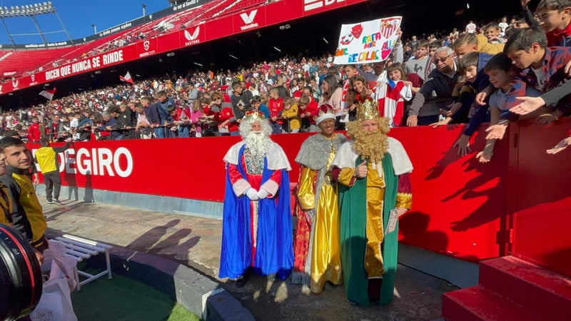 Es el mejor adelanto del día de Reyes que mañana disfrutarán los pequeños y que esta tarde, con la Cabalgata de Reyes Magos de Sevilla, se volcará toda la ciudad. Antes del inicio del entrenamiento, los Reyes pisaron el césped del estadio sevillista y repartieron ya obsequios para los más pequeños.