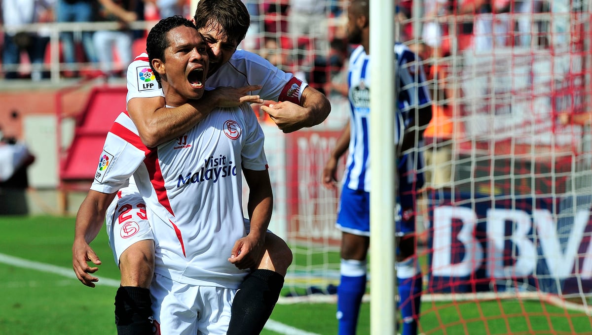 El colombiano logró dejar su nombre en la historia en sólo dos años en Nervión. Monchi le fichó después de meter 28 goles con el Brujas por 10 millones y le vendió por el doble al Milan en 2015. Antes fue bigoleador en la final de Varsovia, una de sus dos UEL, y dejó 49 tantos en 108 partidos.