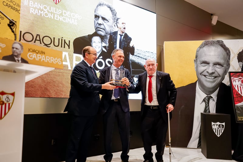 Tercer entrenador con más partidos dirigidos al primer equipo nervionense (200), sólo tras Caparrós y Emery, el coriano, de 85 años, fue reconocido con el I Banquillo de Oro Ramón Encinas