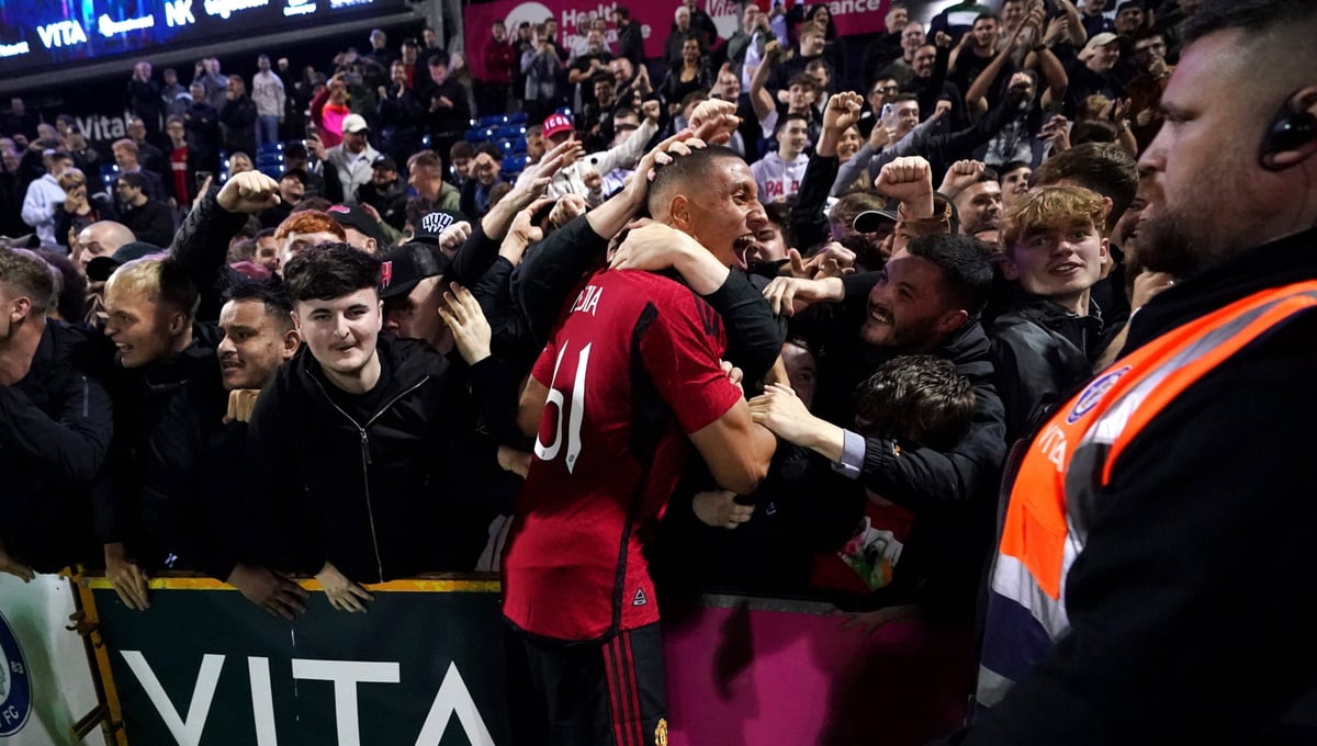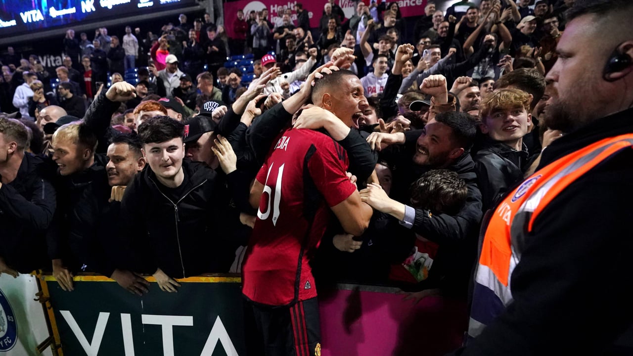Mateo Mejía celebra un gol con la camiseta del Manchester United y lo celebra con sus aficionados. Cordon Press