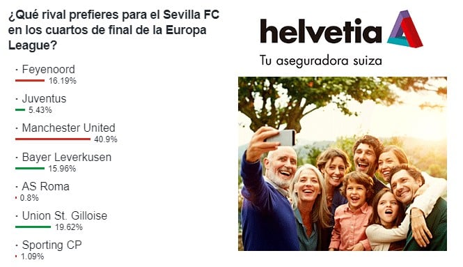 Se da la casualidad además de que el Manchester United era el rival preferido por la afición del Sevilla que ha votado en nuestra #EncuestaHelvetia. El conjunto de Ten Hag fue el más votado con más de un 40% de los votos, demostrando el sevillismo que no teme a ningún rival. Union Saint-Galloise, Bayer Leverkusen y Feyenoord fueron los otros más votados, muy por delante de Roma, Sporting de Portugal y Juventus.