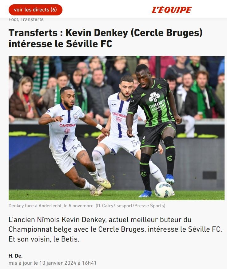 El diario francés L'Equipe asegura que Real Betis y Sevilla FC han mostrado interés en hacerse con los servicios de Kevin Denkey, delantero del Círculo de Brujas belga, autor de 16 goles en 20 partidos en esta primera mitad de la temporada 23/24