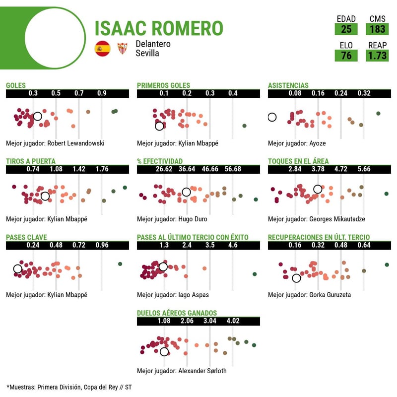 La última comparación es la de Isaac Romero frente a su propio espejo, a sus propios guarismos. La sensación es clara: formidable en su promoción al primer equipo en el mercado invernal de 2024, para desinflarse luego. Sin embargo, observando con detenimiento las gráficas de BeSoccer consultadas por ESTADIO Deportivo, puede comprobarse que la dinámica de esta 25/26 está siendo muy similar a las de los dos cursos anteriores.