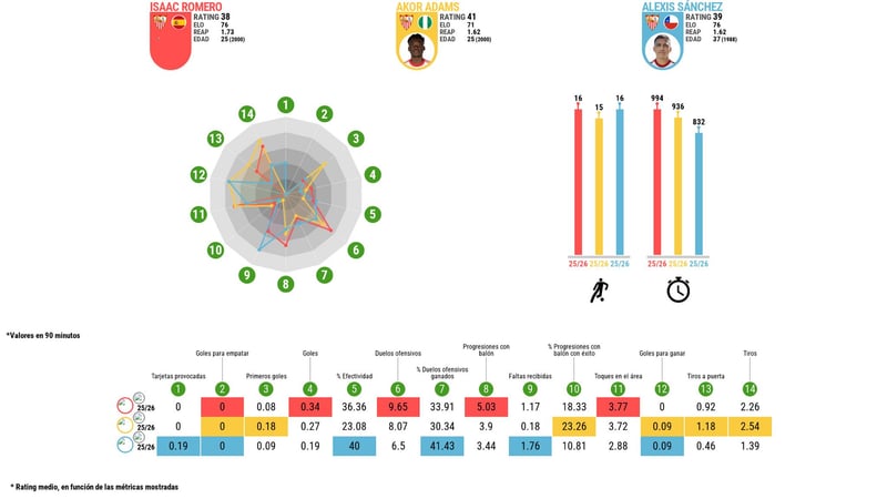Una comparativa entre los números de Isaac Romero, Akor Adams y Alexis Sánchez