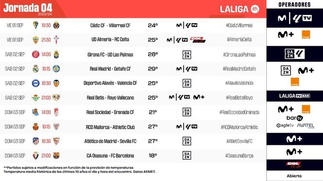 Cabe recordar que la patronal balompédica publica al lado de cada partido unas previsiones meteorológicas y añade que dichos horarios podrán ser modificados por esta misma causa. Y por el momento, se esperan unos 27 grados en la capital madrileña.