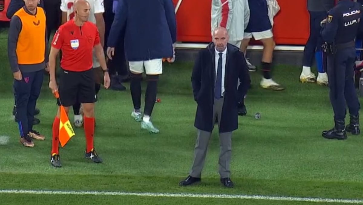 El director deportivo del Sevilla bajó al terreno de juego para protestar y mostró un gran enfado con la actuación arbitral
