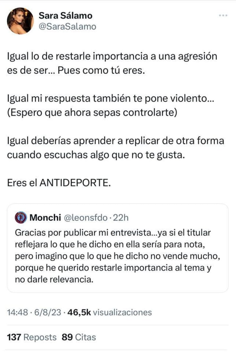 Con eso parecía zanjado un 'culebrón' del que se viene hablando desde diciembre. Sin embargo, la pareja del futbolista malagueño, Sara Sálamo, ha querido contestar a lo que parecía ser el punto final de Monchi con unas duras acusaciones. Muy activa en las redes sociales, la actriz e influencer canaria echó más leña al fuego en su perfil de Twitter con estas palabras: