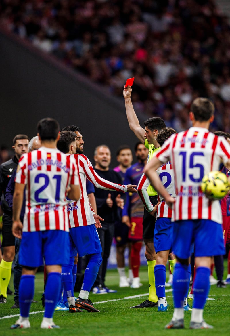 El extremo argentino del Atlético fue expulsado por una entrada sobre Lamine Yamal, "impidiendo con ello una ocasión manifiesta de gol", de acuerdo con el acta y tras una revisión del VAR, que cambió la segunda amarilla que le había mostrado inicialmente el colegiado Mateo Busquets. Como consecuencia del partido frente al Barça, los capitalinos perderán también la próxima jornada (31ª) ante el Sevilla por cumplimiento de ciclo a Koke Resurrección y el 'Cholo', que no se podrá sentar en el banquillo después de haber recibido una amarilla por encararse con Ferrán Torres, "sin llegar al insulto o la amenaza".