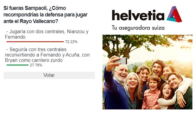 Ahí jugó el pasado jueves el centrocampista brasileño cuando Badé cayó lesionado y como viene siendo habitual, el veterano futbolista rindió a un gran nivel. Con la pareja de centrales ya resuelta, tan solo quedaría por saber quiénes son los elegidos para los laterales: Navas o Montiel, Acuña o Alex Telles. Y esta posibilidad, además de ser la más lógica, pues implicaría menos improvisaciones en el once, también es la elegida por los votantes de ESTADIO Deportivo en nuestra #EncuestaHelvetiaED. Un 72,22% apostaría por colocar a Fernando como central junto a Nianzou. Esto dejaría a Pape Gueye como ocupante de la zona de contención, pudiendo en ocasiones incrustarse también entre los centrales para ayudar en la salida de balón.