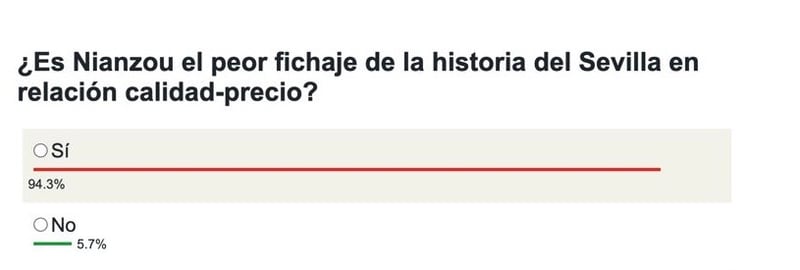 En ESTADIO Deportivo hemos querido palpar las sensaciones de la afición del Sevilla con su fichaje en la historia del conjunto nervionense. A la pregunta de si es el peor fichaje en relación calidad-precio, los resultados han sido muy claros en nuestra Encuesta Helvetia: Sí rotundo. El 94,3% de los votos piensan que es el peor fichaje con diferencia en la historia del Sevilla. Sólo el 5,7% lo salvan de esa posición tan sonrojante. La realidad es que sus números hablan de una operación ruinosa en la económico y en lo deportivo.