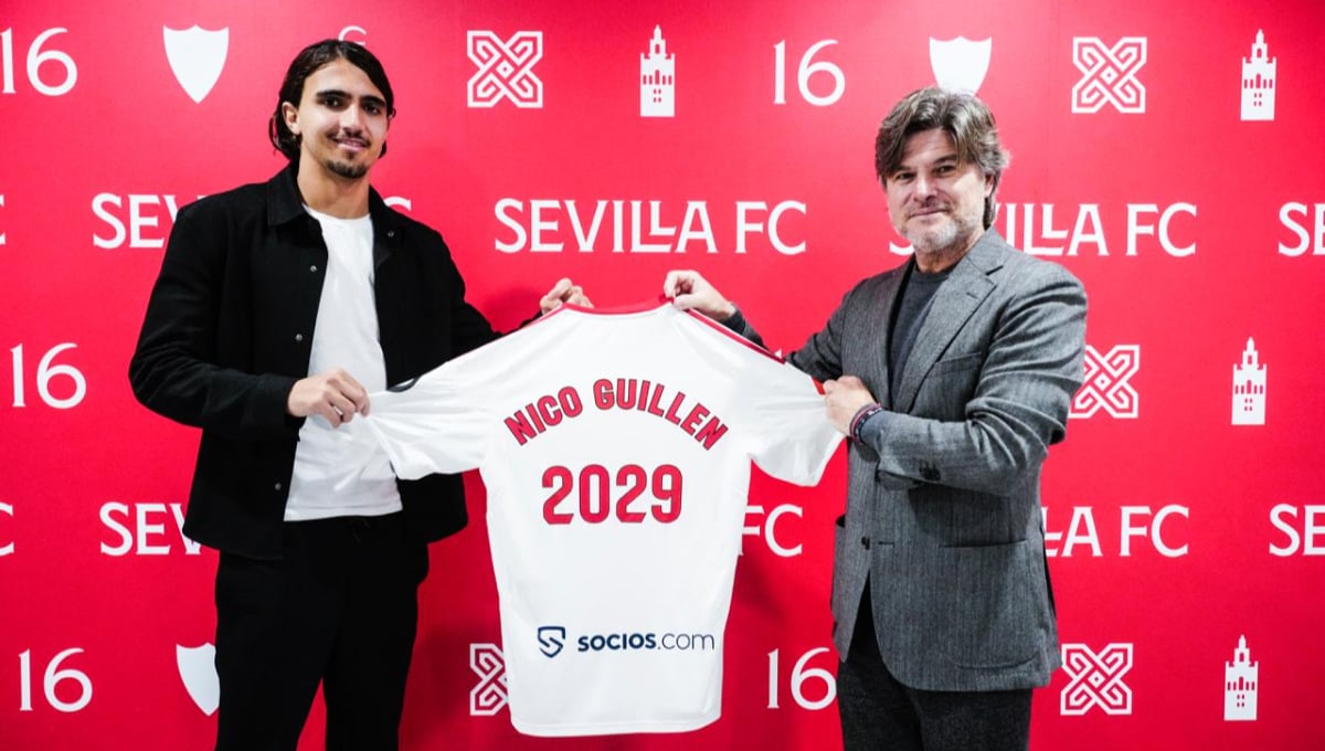 "Nico Guillén ha firmado este viernes su renovación como sevillista hasta junio de 2029. El centrocampista onubense, que llegó muy joven a la cantera, recoge así el premio al gran trabajo realizado y es que -aún en su etapa juvenil- está considerado como una de las grandes promesas blanquirrojas, con presencia incluso con el primer equipo en la pasada pretemporada. A las órdenes de Matías Almeyda anotó un gol en el primer amistoso estival ante el Birmingham City en Faro", ha explicado el Sevilla FC en un comunicado remitido a través de sus canales oficiales.