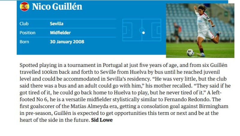"Fue visto jugando un torneo en Portugal con tan solo cinco años y desde los seis Guillén recorrió 100 kilómetros en autobús desde Huelva hasta Sevilla, ida y vuelta, hasta que llegó a la categoría juvenil y pudo ser alojado en la residencia del Sevilla. 'Era muy pequeño, pero el club dijo que había un autobús y que un adulto podía acompañarle. Le dijeron que si se cansaba, podía volver a Huelva a jugar, pero nunca se cansó', recuerda su madre. Es un centrocampista versátil, con un estilo similar al de Fernando Redondo, zurdo número 6. Fue el primer goleador de la era Matías Almeyda, con un gol de consolación contra el Birmingham en pretemporada. Se espera que Guillén tenga oportunidades esta temporada o la próxima y sea el centro del equipo en el futuro", explica el diario The Guardian sobre el prometedor canterano nervionense en el texto que dedica a cada uno de los 60 futuras estrellas de la 'Nueva Generación' futbolística.