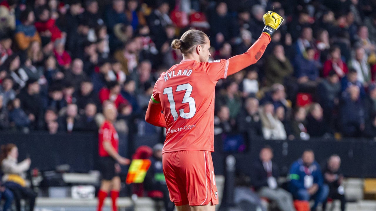 Örjan Nyland es una de las claves de la mejoría del Sevilla FC. El noruego mejora ostensiblemente las prestaciones bajo palos de Marko Dmitrovic, por lo que muchos aficionados nervionenses le echaron de menos durante los dos meses largos que duró su convalecencia de la lesión miofascial que sufrió en noviembre en el cuádriceps de la pierna derecha. Los números globales ya evidencian que el '13' aporta más que el serbio (cuatro victorias con cada uno bajo palos, pero siete empates y sólo tres derrotas en el caso del nórdico, por los tres y doce, respectivamente, del balcánico), aunque, ciñéndose a LaLiga, todo queda mucho más claro. No en vano, con el ex del RB Leipzig, los blanquirrojos únicamente cayeron una vez en el torneo doméstico (1-0, con autogol de Sergio Ramos en las postrimerías de la visita al FC Barcelona en Montjuic), con tres triunfos y seis igualadas.