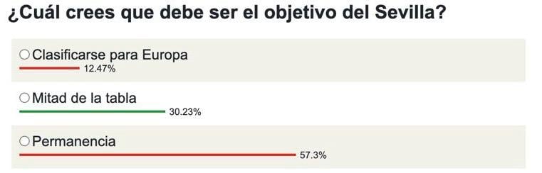 En Estadio Deportivo hemos querido preguntar a la afición sevillista sobre el objetivo que marcarían ellos para el Sevilla en esta temporada. La respuesta obtenida ha sido contundente. El 57,3% de los votos creen que la permanencia es el objetivo del club. Subsistir para seguir creciendo poco a poco y salir de la tremenda crisis económica adquirida. El 30,23% piensa que el equipo puede marcarse la meta de alcanzar la mitad de la tabla y vivir cómodamente. Por último, el 12,47% son los votantes más atrevido y piensan que hay que competir por intentar rascar un puesto europeo y volver a la senda de los triunfos sevillistas en Europa.