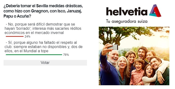 Así, un 76% de los participantes no dudaría en emprender dichas acciones, como ya se hizo no hace mucho con el defensa Joris Gnagnon, al que se le rescindió el contrato alegando falta de profesionalidad por estar totalmente fuera de forma. Este porcentaje de la afición entienden que algunos de estos jugadores ha faltado al respeto al club ya sea por motivos disciplinarios o por estar fuera de forma y otros se han 'borrado' de partidos con el Sevilla para luego estar a tope en el Mundial. Por el contrario, un 24% no cree que tomar ese tipo de medidas sea lo más idóneo pues sería difícil demostrarlo ante un hipotético juicio, y que lo idea sería intentar llegar a un acuerdo para su rescisión o bien intentar buscarles un sitio en el mercado de enero.