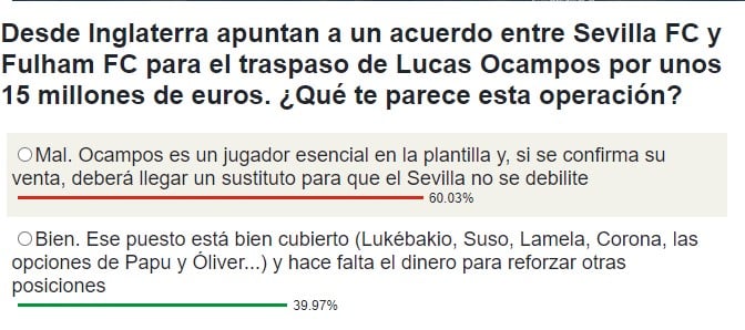 Mientras tanto, el jugador ha vuelto a entrenarse en la mañana de hoy como uno más a las órdenes de Mendilibar, con quien se le ha visto manteniendo una conversación. A la espera de nuevos acontecimientos, la afición tampoco ha dudado en manifestarse en las redes sociales, pidiendo a Ocampos que no se vaya del Sevilla y por eso mismo nuestra #EncuestaHelvetiaED iba enfocado a ese asunto. Y aunque hay división de opiniones, el 60% de los participantes no vendería a Ocampos por 15 millones de euros, ya que se es un jugador esencial en la plantilla y caso de que se vendiera, tendría que llegar un recambio (suena el azulgrana Abde).