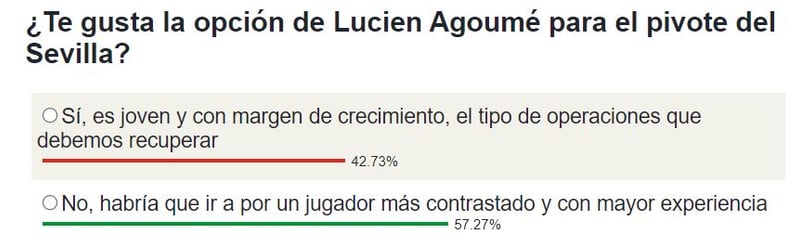 Preguntados por ESTADIO Deportivo en la #EncuestaHelvetiaED, el sector sevillista que participó en el sondeo emitió dudas razonables en una opinión claramente dividida ante la incorporación de este joven jugador para un puesto en el que el Sevilla FC se ha quedado solo con Boubakary Soumaré, que está también cedido -por el Leicester City- y además lleva días sonando como opción para el SSC Napoli italiano, más allá de las ayudas de Rakitic, Jordán o Sow, que para nada son pivotes. Un 57,3 por ciento de los votantes aboga por buscar un perfil de jugador más contrastado ante la necesidad del equipo de encontrar respuestas y rendimiento inmediato; pero un considerable 42,7 por ciento consideraría que la llegada de Agoumé sería una buena incorporación.