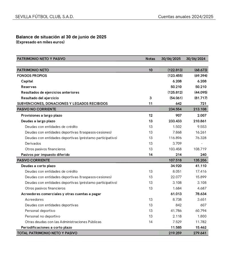 A pesar de todo ello, desde el órgano rector del Sevilla FC aseguran que no hay motivo para el alarmismo. Alega que "el patrimonio neto a efectos de reducción de capital y causas de disolución previstas en la legislación mercantil ascendería a 63,369 millones de euros (positivo), teniendo en cuenta los préstamos participativos que posee el club" y que "la liquidez de la sociedad está completamente garantizada" hasta la finalización de las maniobras puestas en marcha.