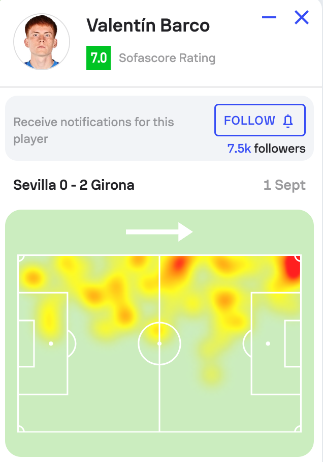 El mapa de calor que ofrece una de las páginas especializadas en los análisis táctico y estadístico, Sofascore, desvela sin discusión la masiva presencia del 'Colo' en parcelas interiores. Y, aunque es justo reseñar su grosero error de marca en el 0-1 de Iván Martín ante el Girona FC, el argentino hizo muchísimas cosas bien en su estreno con el Sevilla FC. Para otra referencia en el sector, WhoScored, fue el mejor de los locales (con una nota de 7.12) y el tercero de todo el encuentro (tras los visitantes Bryan Gil y Alejandro Francés). Debe mejorar en muchos aspectos (un solo regate completado de seis intentados), pero solamente Isaac Romero (5) disparó más que Barco (3), que fue el nervionense que más pases claves (servicios inmediatamente anteriores a un tiro) dio (4), con un acierto global no muy alto (83%), explicable por el riesgo que asumió (90 toques al balón, más que ningún compañero, con 21 pérdidas). Eficaz en defensa (líder en tackles, con 6, y cruces, con 10 duelos terrestres ganados de 17, más una intercepción), provocó tres faltas y no cometió ninguna. Una carta de presentación, pese al referido fallo, digna de consideración en pos de ese lateral interior.