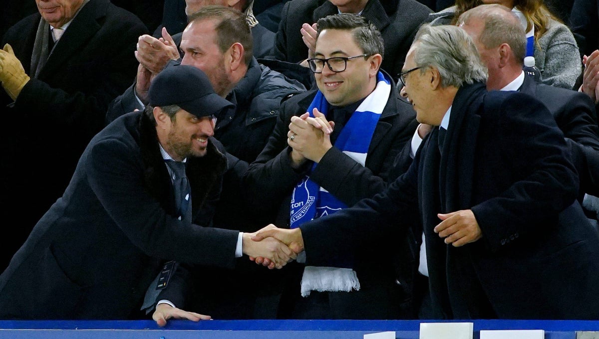 Josh Wander (con gorra), uno de los dos socios confundadores del fondo estadounidense, saluda al entonces máximo accionista de los 'Toffees', Farhad Moshiri, en el palco de Goodison Park.CORDON PRESS