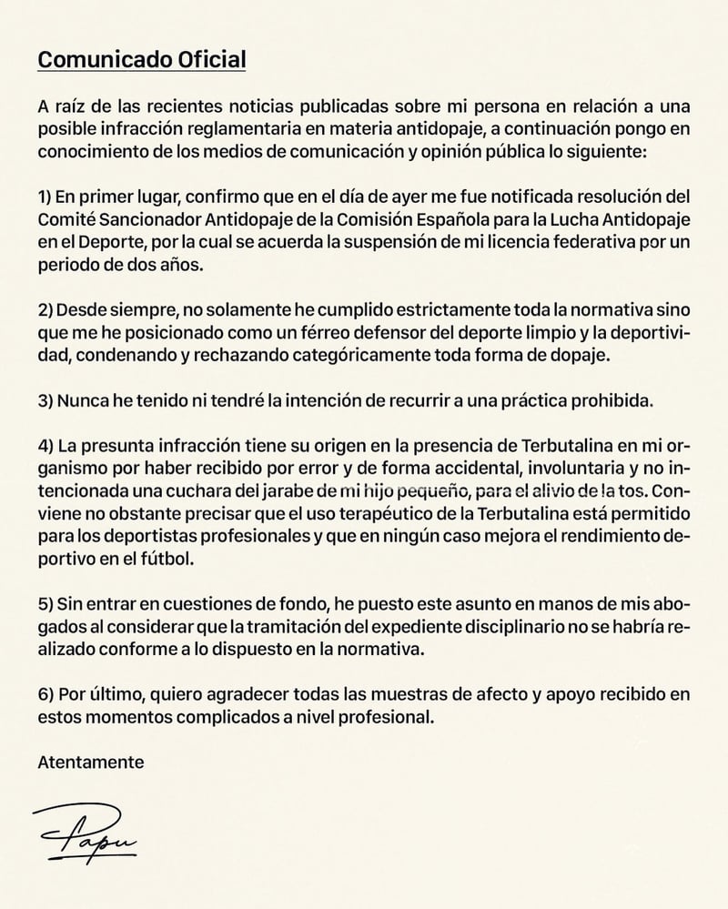 Dos días después, el futbolista ha roto su silencio con un comunicado en sus redes sociales que comienza con la admisión de que ha recibido la notificación por parte del comité sancionador, pero defendiendo no ya su inocencia, sino su compromiso contra este tipo de medidas ilegales. "Desde siempre, no solamente he cumplido estrictamente toda la normativa, sino que me he posicionado como un férreo defensor del deporte limpio y la deportividad, condenando y rechazando categóricamente toda forma de dopaje", explica el 'Papu', que nunca ha tenido ni tendrá "la intención de recurrir a una práctica prohibida", aunque se excusa así: "La presunta infracción tiene su origen en la presencia de terbutalina en mi organismo por haber recibido por error y de forma accidental, involuntaria y no intencionada una cucharada del jarabe de mi hijo pequeño para el alivio de la tos".