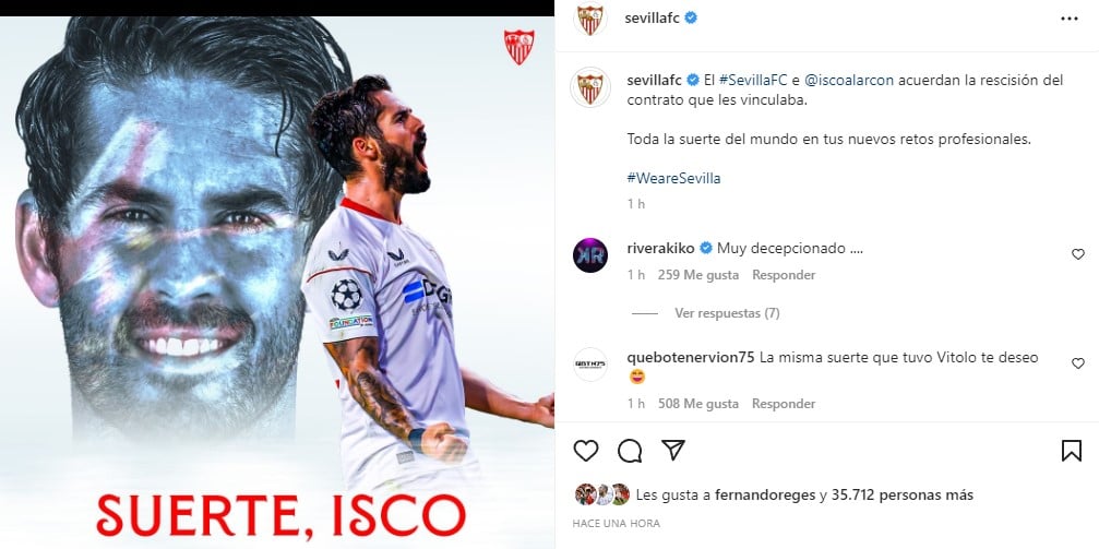 En la mañana de hoy se ha confirmado el adiós definitivo de Isco Alarcón al Sevilla Fútbol Club. La entidad de Nervión ha informado, a través de un comunicado oficial, que el club y el jugador llegaban a un acuerdo para la rescisión del contrato del malagueño que había llegado al Sevilla hace apenas cuatro meses y había firmado un contrato por dos temporadas, hasta el 30 de junio de 2024.