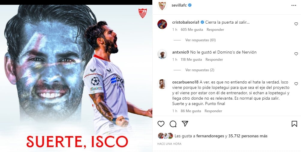 "Cierra la puerta al salir...", ha escrito Soria, que en su momento fue uno de los muchos sevillistas que dio la bienvenida a Isco Alarcón confiando en que el malagueño pudiera recuperar en Nervión todo el fútbol que demostró en su mejor época en el Real Madrid.