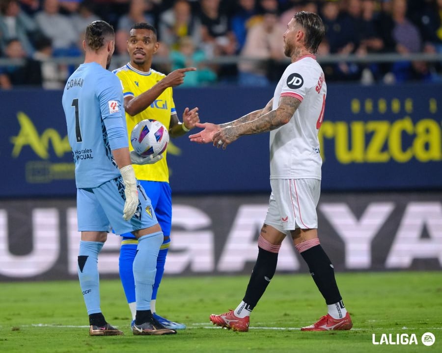 Pero Sergio Ramos también fue protagonista más tarde de otra de las polémicas jugadas. Y es que el central lograba marcar su primer gol con la camiseta del Sevilla con un remate dentro del área pero pese a que Soto Grado concedía el gol, segundos más tarde lo anulaba a instancia de su juez de línea por un fuera de juego posicional de Ocampos, que a entender del colegiado, entorpecía la vista al portero cadista Conan Ledesma.