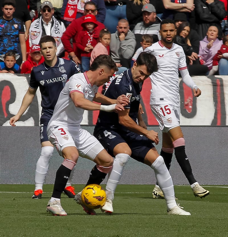 "No esperábamos tampoco que la Real Sociedad fuera a salir con tantos suplentes. Con esa alineación, teníamos que salir desde el principio a 'matar'. Siendo chavales jóvenes, tenían que salir nerviosos, por lo que queríamos que se les notara. Ha sido un partido bastante solvente", presumía en zona mixta un Adrià Pedrosa que aprovechó la lesión de Marcos Acuña y la sanción a Lucas Ocampos para recuperar la titularidad en el carril izquierdo del Sevilla FC. Lo hizo con un triunfo, menos holgado de lo que apuntaba en un principio, pero muy válido para alejarse casi definitivamente del peligro. Y eso que el 2-1 al filo del descanso, obra de André Silva de penalti, pudo complicarles la cosa: "Suelen ser goles psicológicos ésos que se hacen al final de la primera parte, pero estábamos tranquilos, porque las cosas se estaban haciendo bien. Es verdad que no teníamos el balón como queríamos, pero ellos no estaban creando peligro; estábamos cómodos".