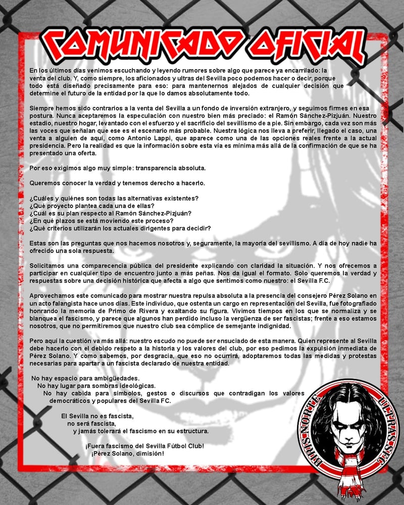 El ruido apunta a que los principales accionistas están ansiosos por cerrar este proceso lo antes posible y hay quien apunta a que incluso podría haber novedades muy concretas al respecto antes del final de este 2025. En ese sentido, la Junta General Ordinaria de Accionistas del Sevilla FC que se celebrará en la tarde de este próximo lunes, día 15 de diciembre, se antoja clarificadora en esa hoja de ruta a cortísimo plazo. Para prepararse para este cónclave que una vez más se presume bastante tenso, para reclamar toda la transparencia del mundo en este proceso de venta y para blindar los símbolos de la entidad se han unido la Federación de Peñas Sevillistas San Fernando, el grupo Accionistas Unidos del SFC y el grupo de animación Biris Norte.
