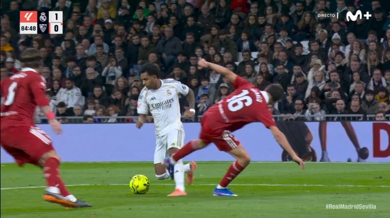 En el minuto 85, pena máxima sin discusión de Juanlu Sánchez a Rodrygo Goes, pues el quinteño patea al de Osasco a la altura de la rodilla dentro del área. Pero, cinco minutos antes, el '16' sevillista fue derribado cuando entraba en el área por Fran García sin que ni el colegiado principal señalase nada, cuando se ve claramente cómo le golpea con el pie izquierdo en su tobillo derecho. La duda es si se produce dentro o fuera, porque cambia la impresión según la repetición, pero el contacto existe y el VAR pasó también de revisarlo.