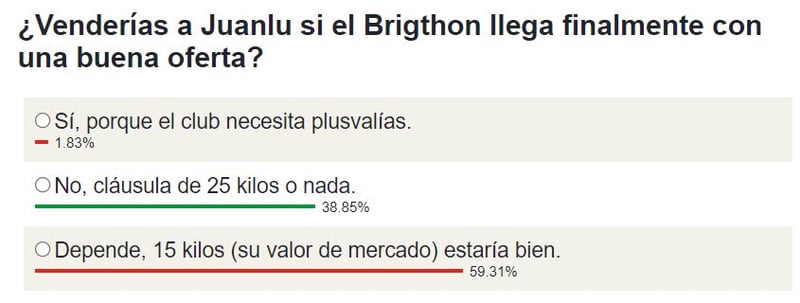 Según ha podido confirmar ESTADIO Deportivo, el interés del Brighton & Hove Albion FC en el fichaje de Juanlu va muy en serio. Eso sí, por mucha solvencia económica que tengan los clubes de la Premier League -y más después del último contrato que hará que el que menos cobra de Inglaterra reciba más dinero que el tercero que más ingresa en España-, las informaciones que hablan de que 'Las Gaviotas' están dispuestas a pagar los 25 millones de euros de su cláusula de rescisión no se ajustan a la verdad. Al menos a día de hoy, los tanteos a título informativo del club de Sussex del Este van encaminados a ofertas sensiblemente inferiores a ese coste de 25 kilos.
