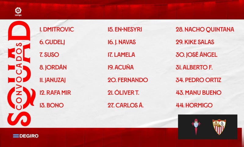 En total, son 21 los jugadores citados por Jorge Sampaoli, entre los que hay ocho jugadores del primer filial y trece tan solo del primer equipo, pues además de los lesionados de larga duración como Tecatito Corona y Marcao, se unen la de los mundialistas que cayeron en Qatar, Thomas Delaney, Alex Telles y el 'Papu' Gómez, así como Karim Rekik, que sufrió unas molestias en el choque de Copa del Rey ante el Juventud Torremolinos y no ha llega a tiempo para la cita de Vigo. A todas estas bajas por lesión, hay que añadir dos por sanción, pues cabe recordar que tanto Tanguy Nianzou como Ivan Rakitic fueron expulsado en el último choque de LaLiga ante la Real Sociedad y deberán cumplir un partido de sanción en esta jornada, así como la Montiel, por su sanción tras el derbi liguero.