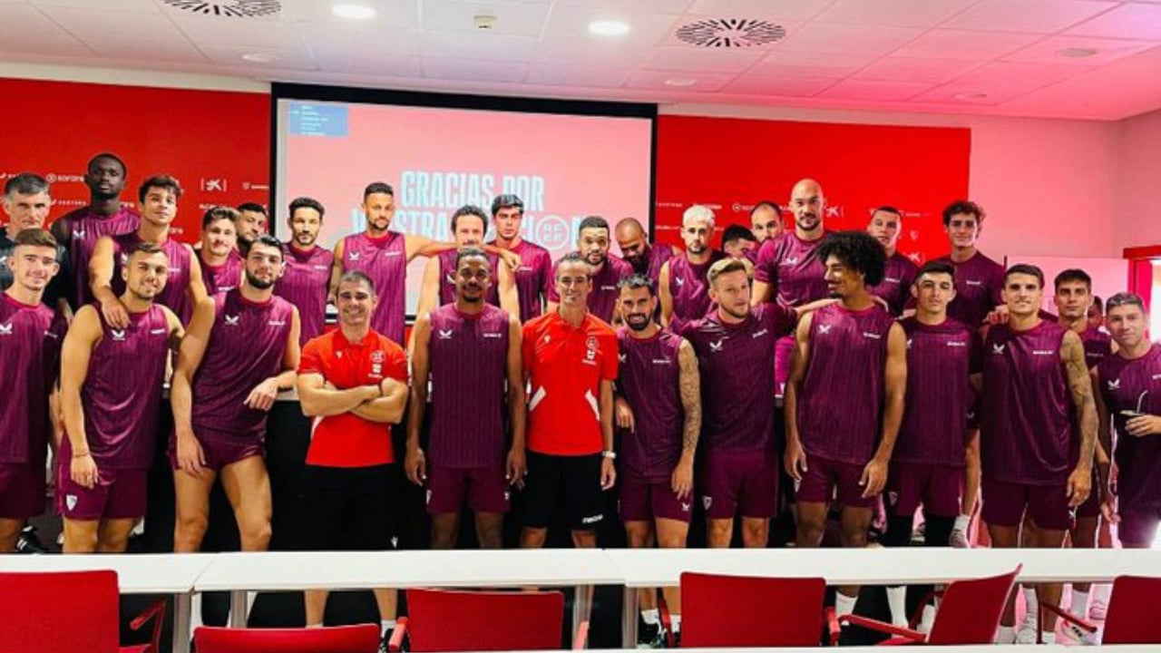La plantilla del Sevilla posando tras una charla formativa del CTA.Imagen Sevilla FC