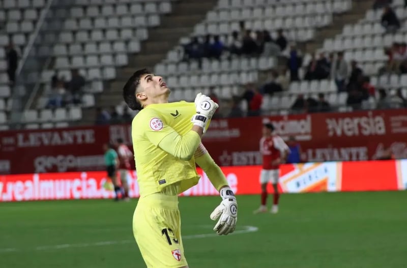 En 26 partidos disputados en el Grupo 2 de la Primera RFEF, el de Fuentes de Andalucía sólo ha encajado 23 goles (0,88 por encuentro) y tiene un asombroso 50 por ciento de imbatibilidad, ya que ha dejado su portería a cero en 13 de esas 26 jornadas en las que acumula un total 61 intervenciones (2,35 por choque), la gran mayoría de enorme complejidad y con tres penaltis detenidos. "El Guardián de Nervión", destacan como apodo desde los perfiles oficiales de la tercera competición del fútbol español. Sin embargo, pese a ser un habitual en los entrenamientos de los mayores desde hace cuatro años y salirse con el filial, sólo suma un partido oficial: un 1-3 en Getafe en los octavos de final de la Copa del Rey 2024.