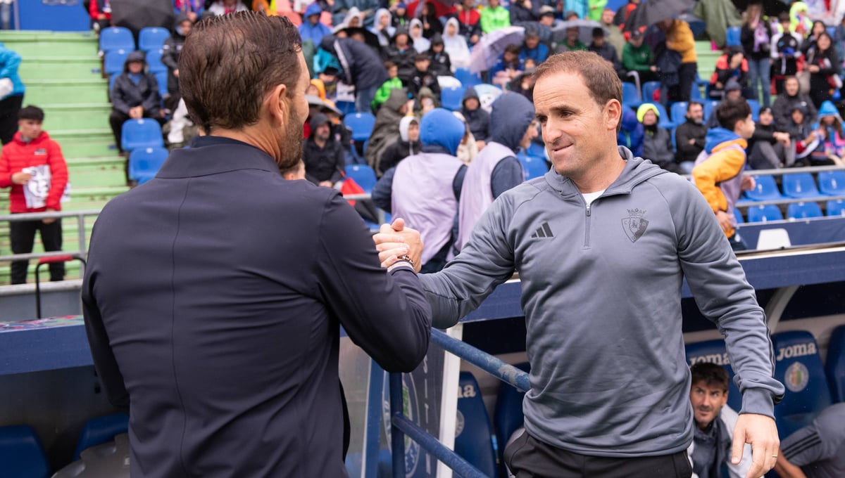 Bordalás y Arrasate se saludan recientemente en el Coliseum.CORDON PRESS