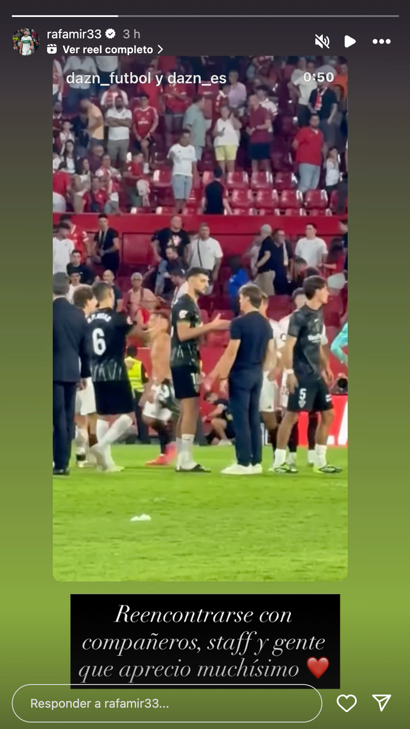 Unas horas después, Rafa Mir trató, como suele decirse, de correr un tupido velo y quitar hierro a lo que había sucedido, aprovechando una publicación de DAZN en la que se le ve buscando algunos abrazos y saludos a la finalización del choque. Sorprendió por detrás al 'Pelado', que, es de suponer que más por educación que por ganas, le devolvió el gesto. Hicieron de tripas corazón Andrés Castrín y Djibril Sow, aunque poco más, ya que la mayoría pensaba y le reconoció, en público o en privado, que podría haberse ahorrado tanta efusividad por respeto no ya a la entidad, con la que ha tenido una relación tirante que verbalizó nada más llegar cedido a Valencia, sino con una hinchada que quizás no le ha brindado mayoritariamente cariño, pero a la que debe seguir cobrando puntualmente en gran medida. Sin duda, un momento incómodo del que quiso salir el protagonista con un mensaje en su Instagram: "Reencontrarse con compañeros, staff y gente que aprecio muchísimo".