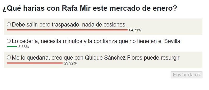 Rafa Mir, a sus 26 años, tiene contrato con el Sevilla hasta el 30 de junio de 2027 en donde nunca ha terminado de rendir como se esperaba de él desde que llegó procedente del Wolverhampton Wanderers a cambio de unos 15 millones de euros. El delantero no ha rendido en el terreno de juego y tampoco ha conectado con la afición que es partidaria de su traspaso tal y como se puede comprobar en la encuesta que realizó ESTADIO Deportivo en la que casi un 65 por ciento es partidaria de su salida, por sólo el 5 por ciento que lo cedería y casi el 30 por ciento que lo mantendría en la plantilla sevillista.