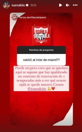 Y parece que todos los indicios van por ese camino... el de la renovación. Su buen rendimiento en el campo, sus palabras en la previa del derbi y ahora, una elocuente 'storie' que ha compartido en su perfil de Instagram de la cuenta @forza.sevillacampeon donde deja entrever su renovación por dos temporadas más al ser preguntado sobre la posibilidad de que Ivan Rakitic se marche al Inter Miami.