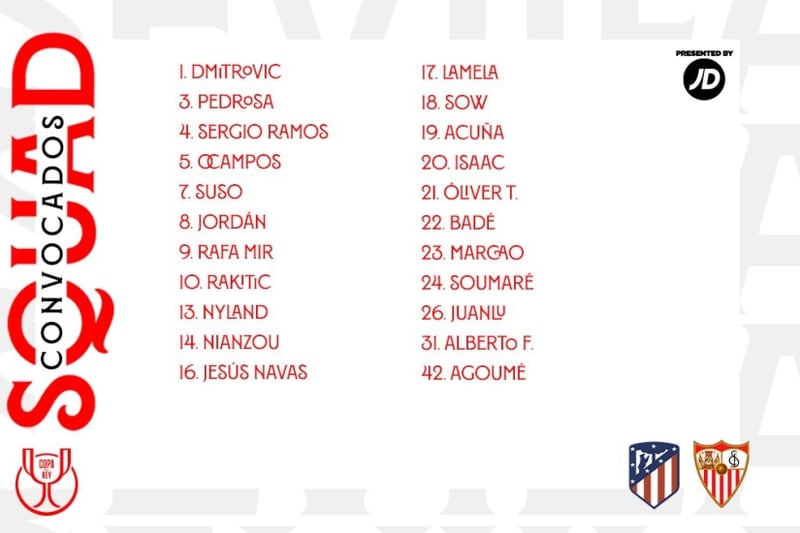 La lista de elegidos está compuesta por: los porteros Marko Dmitrovic, Örjan Nyland y Alberto Flores; los defensas Juanlu Sánchez, Jesús Navas, Marcos Acuña, Adrià Pedrosa, Sergio Ramos, Loïc Badé, Tanguy Nianzou y Marcao Teixeira; los centrocampistas Boubakary Soumaré, Lucien Agoumé, Djibril Sow, Joan Jordán, Ivan Rakitic, Óliver Torres, Suso Fernández, Lucas Ocampos y Erik Lamela; así como los delanteros Rafa Mir e Isaac Romero. Una muestra de que, teniendo en cuenta el oponente y la competición, se apostará de nuevo por un planteamiento conservador, cruzando los dedos para que la efectividad vuelva a estar de cara, como en el Coliseum, para avanzar en el torneo que supone la línea más recta, directa y factible para repetir el curso venidero en Europa.