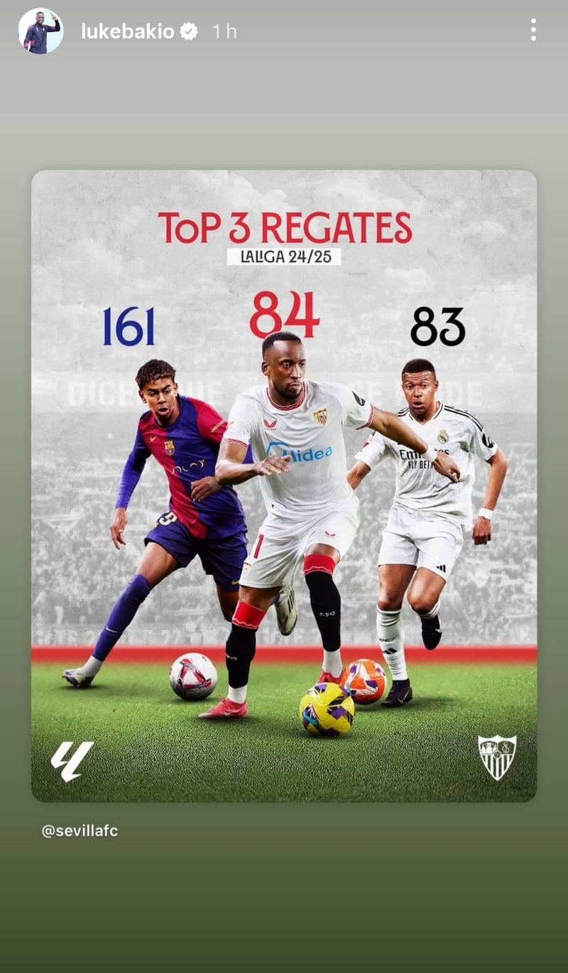 En total, el '11' blanquirrojo ha completado de manera exitosa 84 'driblings', lo que le lleva a compartir podio con Kylian Mbappé, gran estrella estrella del Real Madrid que logró 83, y con Lamine Yamal, descollante talento del FC Barcelona que lideró esta clasificación con la asombrosa cifra de 161 fintas; casi tantas como las que suman junto entre el belga y el francés. Los medios oficiales del Sevilla FC no han dudado en presumir de esta estadística, que ha sido compartida también por Lukébakio a través de sus perfiles en redes sociales.