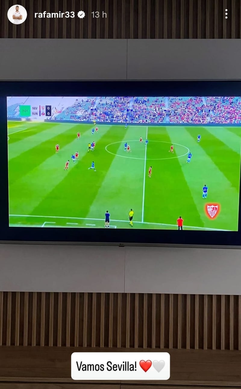 "¡Vamos, Sevilla!", seguido de un corazón blanco y otro de color rojo, fue el mensaje que compartió Rafa Mir en las 'stories' de su cuenta de Instagram para comentar una fotografía en la que se ve una pantalla de grandes dimensiones con la retransmisión en directo que los medios de comunicación del club ofrecieron en este segundo test estival, donde la cruz volvieron a ser los groseros errores defensivos (esta vez, José Ángel Carmona) y la más que evidente falta de pegada; mientras que la cara fue el positivo debut de Gabriel Suazo, que se estrenó como sevillista dando una asistencia en el gol con el que Rubén Vargas puso el definitivo 1-1.