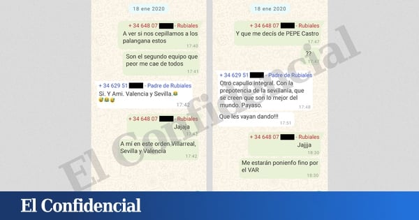El diario El Confidencial publicaba el pasado martes una nueva entrega de los 'Supercopa Files'. Esta vez, el revuelo mediático no eran unos audios sino unas capturas de una conversación de WhatsApp entre el presidente de la RFEF y a su padre. "A ver si nos cargamos a los palanganas estos", escribía Rubiales el mismo día que vio desde el palco del Santiago Bernabéu un polémico encuentro entre Real Madrid y el Sevilla FC que acabó con Monchi expresando sus ganas de "sacar al equipo del campo".