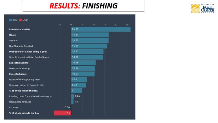 Pero lo más relevante de este estudio gira en torno a las variables de finalización de juego. Así, resulta muy destacable la mayor probabilidad de que los equipos con tres centrales consigan más goles, asistan mejor y obtengan un mayor porcentaje de tiros a portería, a tenor de la muestra seleccionada. Así, las variables estadísticamente más significativas fueron: asistencias intencionadas, goles, probabilidad de que un tiro sea gol, goles esperados y asistencias esperadas.