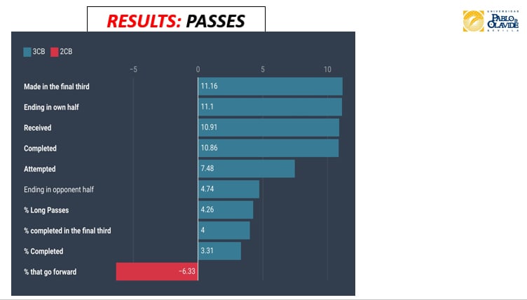 En la primera de ellas, se constató que los sistemas de tres centrales, como los que utilizaron aquella campaña Quique Setién en el Betis y Pablo Machín, finalmente destituido, en el Sevilla, pasan más y, sobre todo, mejor que los de dos centrales. Es decir, obtienen un mejor porcentaje no sólo de pases intentados, sino también completados, siendo curioso también, por ejemplo, su menor media de pases atrás.
