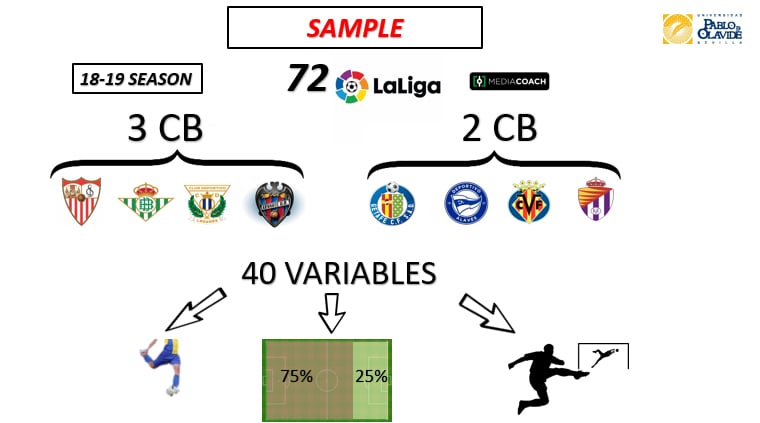 Para que la muestra fuese representativa, se excluyó de la misma a los cuatro equipos que lograron clasificarse para la UEFA Champions League y a los tres que acabaron descendiendo. Así, tanto el Sevilla FC como el Real Betis son protagonistas del estudio, encuadrados en el grupo de conjuntos que jugaron al menos 15 encuentros ligueros en dicha campaña con tres centrales, analizándose sus datos junto a los de Levante y Leganés y comparándolos a su vez con los de Getafe, Villarreal, Alavés y Valladolid.